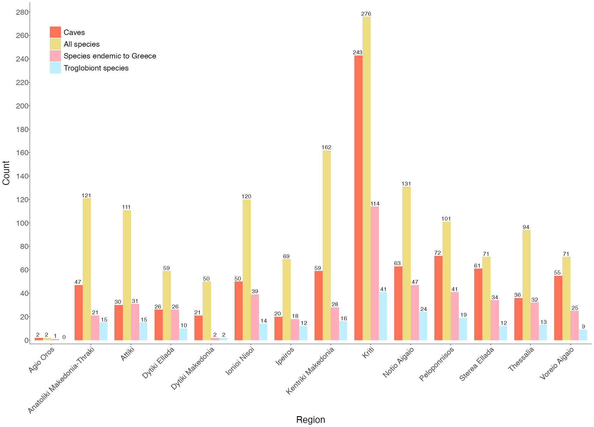 Kriti (Crete) is the most studied Region of Greece (31.1% of the caves). Insular Regions (N & S Aegean, Ionian Islands, and Crete) are hosting a remarkable percentage of endemic and troglobiont species.
