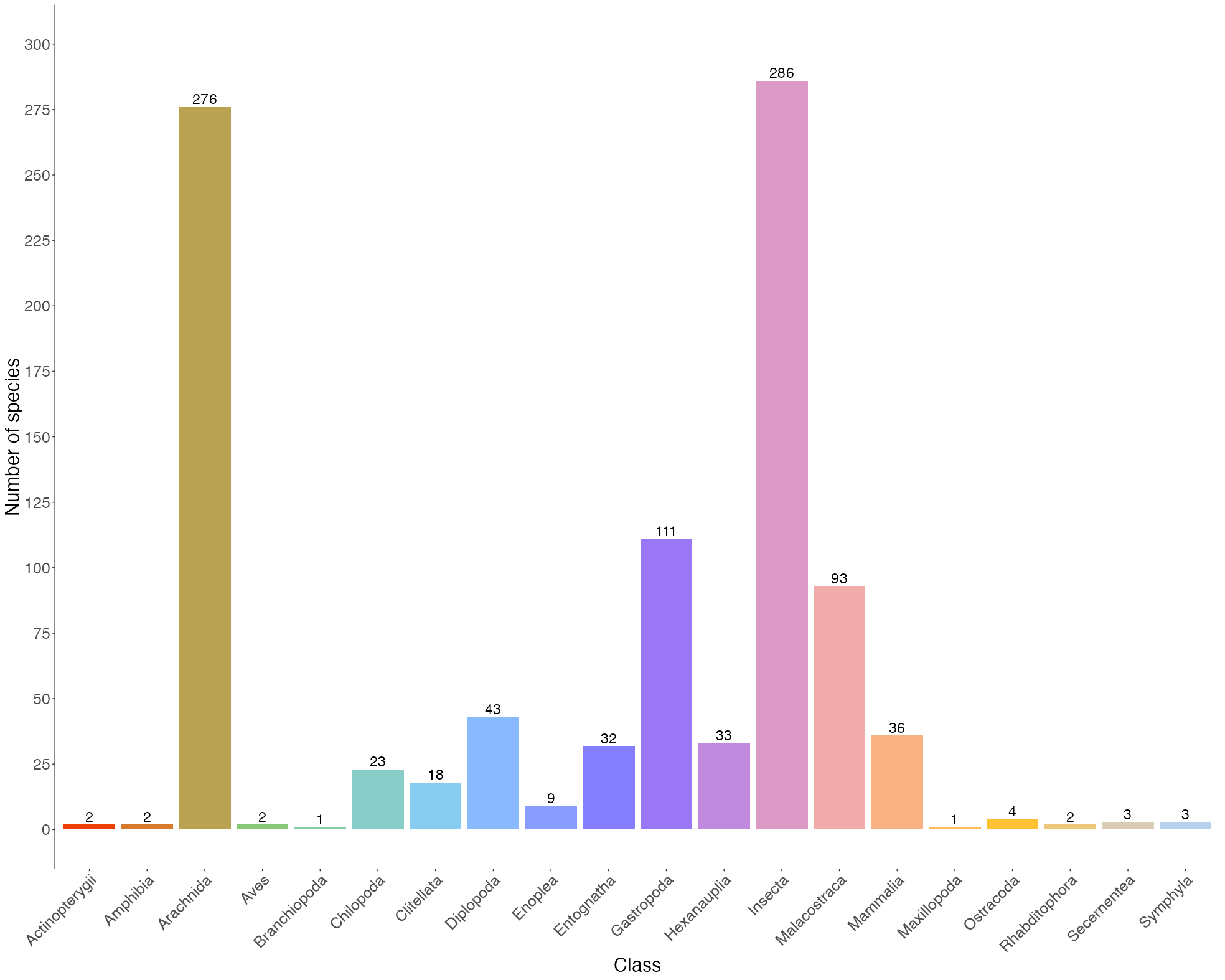 There are 980 species in 492 genera, 218 families, 69 orders, 20 classes, and 6 phyla. The most diverse Classes are Insecta (Ectognatha) (28.9%) and Arachnida (28.1%) [Araneae 15.8 %].