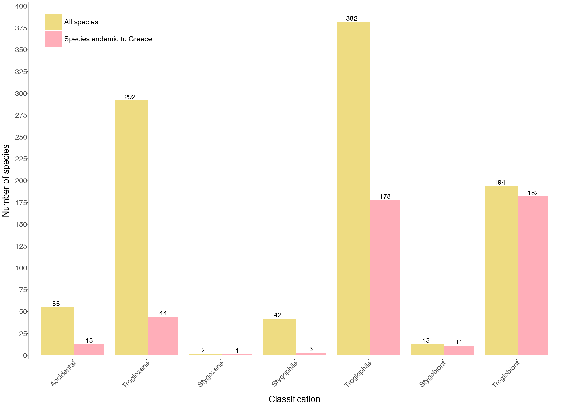 Nearly half of the species in the cave fauna of Greece are Greek endemics. Obligate cavernicolous species (troglobionts/stygobionts) represent 19,5% of the cave fauna, and the vast majority are steno-endemic. Only 14 species are not endemic to Greece