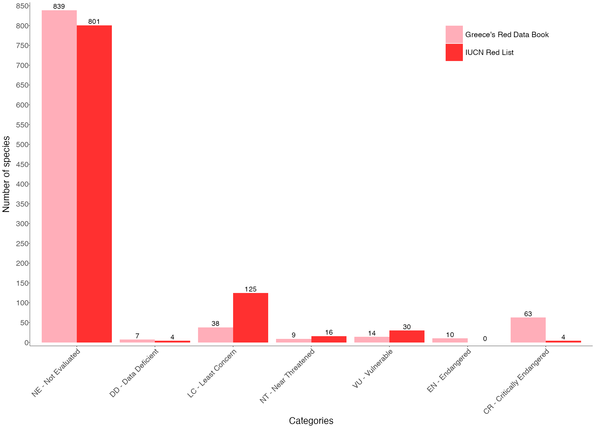 The majority of the species found in the caves of Greece have not been evaluated either for the IUCN Red List (81.4%) or the GR Red Data Book (85.4%). The adequately evaluated groups are bats, orthopterans, and molluscs. Only nine out of the 100 obligate cavernicolous species have been evaluated.